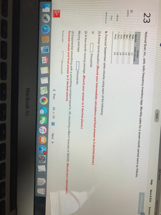 National Scan Inc. sells radio frequency inventory tags. Monthly sales for a 7-month period were as follows. MonthSales/units. Feb18. Mar21. Apr15. May23. Jun20. Jul26. Aug23. Forecast September sales volume using: Linear Trend - Yt _____ thousands. ... Retrieve Full Source