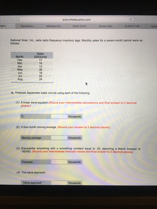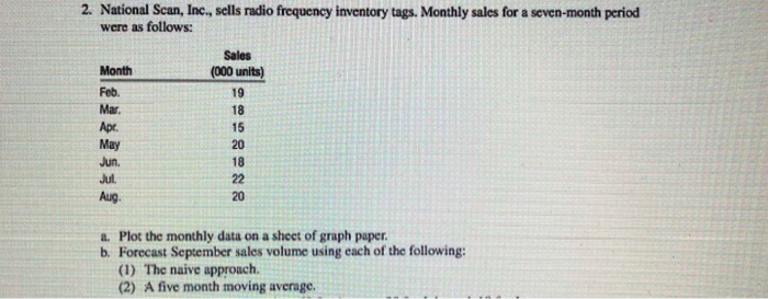 #2: National Scan, Inc., sells radio frequency inventory tags. Monthly sales ($000) for a seven-month period were as follows: Month Sales Feb 19 Mar 18 Apr 15 May 20 Jun 18 Jul 22 Aug 20 a. Plot the monthly data. b. Forecast September sales volume in thousands of dollars using the following methods: Show your answers in the space provided. 1. ... Retrieve Full Source